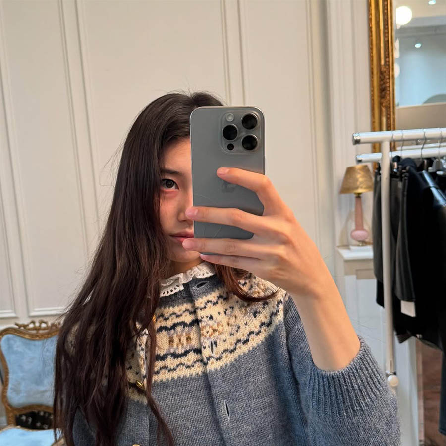 수지는 레이스 카라 포인트의 노르딕 스웨터를 착용했습니다. 노르딕 패턴 면적이 작아 자칫하면 밋밋해 보일 수 있지만, 레이스 카라로 하나로 노르딕 패턴에 사랑스러움까지 더해졌죠.