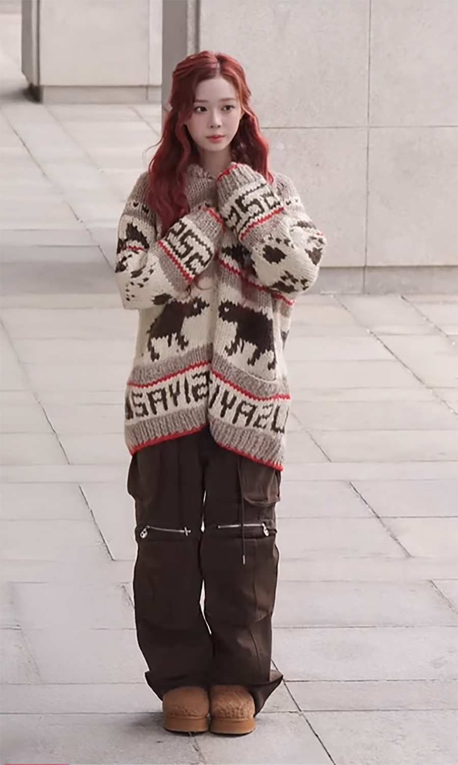 에스파 윈터는 노르딕·코위찬 특유의 패턴과 오버핏 바지를 함께 매치하여 캐주얼하고 힙한 스트릿 감성을 살렸습니다. 오버핏의 스웨터, 와이드 팬츠를 코디하면 개성 있는 겨울룩이 완성됩니다.