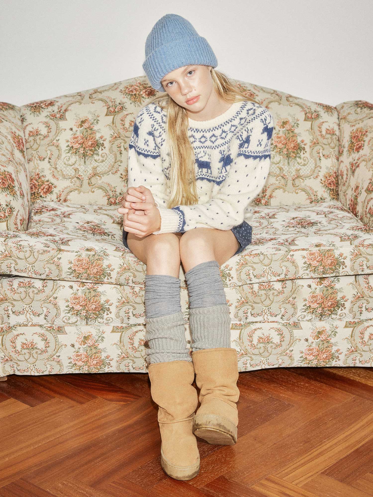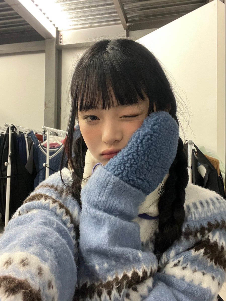 하니는 하늘색 노르딕 니트에 같은 푸른색 계열의 장갑을 매치하여 귀여운 느낌을 더했습니다. 톤온톤으로 노르딕 패턴을 코디할 경우, 복잡함이 정리되고 통일감이 생기죠.