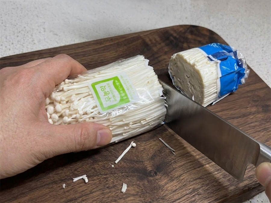 팽이버섯을 비닐 벗기고 자르면 가닥이 흩어지고 이물질이 떨어지기 쉽습니다. 특히 팽이버섯의 밑동에는 톱밥이나 오염물이 있을 수 있기 때문에 비닐째 자르는 것이 더 위생적입니다.