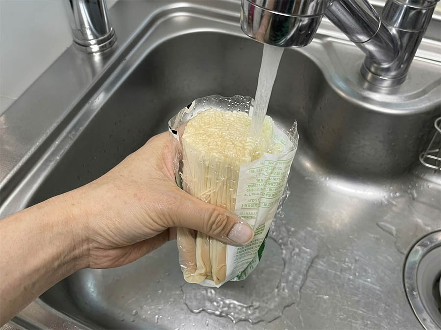 팽이버섯은 물에 오래 담그면 영양소가 빠지고 식감도 물러집니다. 비닐봉지 안에 물을 넣고 가볍게 헹군 후 사용하세요.