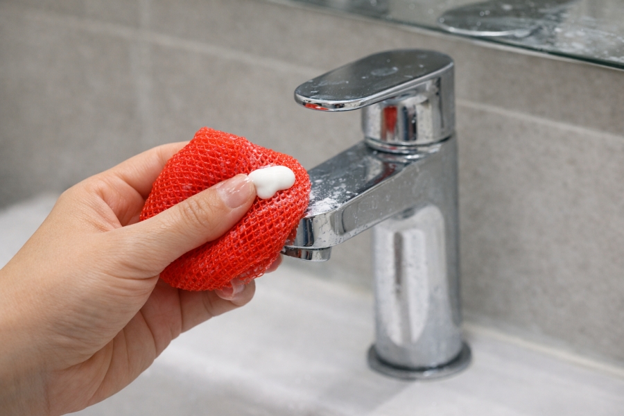 ② 싱크대 청소에는 주방세제를 거품 낸 뒤 양파망으로 원을 그리듯 닦아주세요.