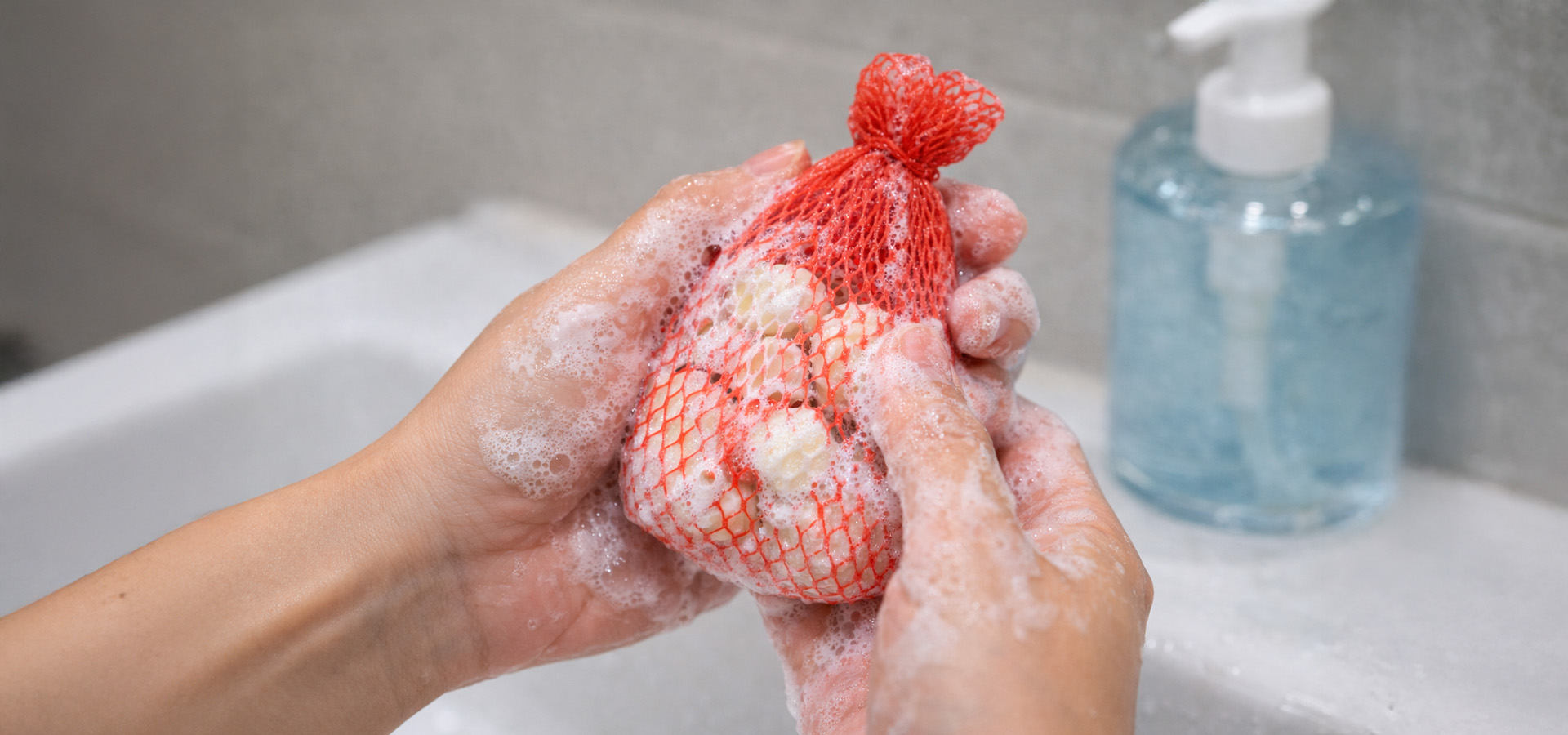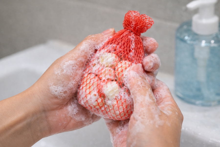① 자투리 비누를 양파망 안에 넣고 입구를 단단히 묶어주세요.