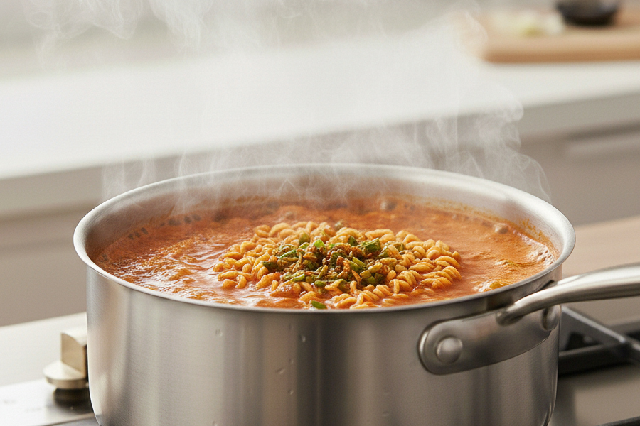 먼저 각자가 기존에 해오던 스타일로 라면을 끓여주세요! 최강록 셰프의 계란 라면 레시피는 조리 마지막 단계에 계란을 추가하는 것이 특징입니다. 면은 푹 익히지 말고 90% 정로도 익혀주세요.