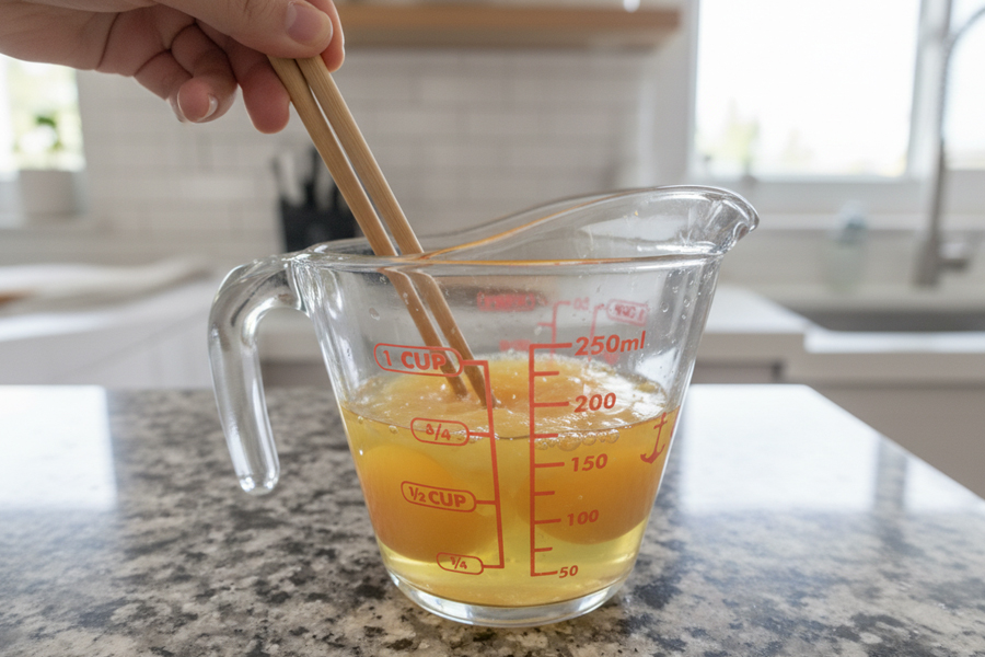 계란 2개는 그릇에 넣어 젓가락으로 풀어주세요. 흰자와 노른자가 골고루 섞일수록 완성했을 때의 식감이 부드러워집니다.